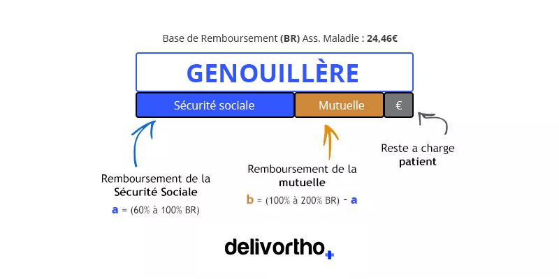Prenons l'exemple d'une genouillère dont le prix est de 30€ et la base de remboursement de 24,46€.